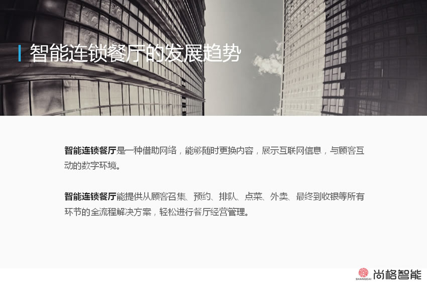 智能連鎖餐廳能提供從顧客召集、預(yù)約、排隊(duì)、點(diǎn)菜、外賣、最終到收銀等所有環(huán)節(jié)的全流程解決方案,輕松進(jìn)行餐廳經(jīng)營(yíng)管理。